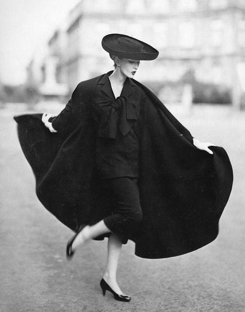 Dovima in cape ensemble by Lanvin-Castillo, photo by Avedon, Place Francois-Premier, Paris, August 1955