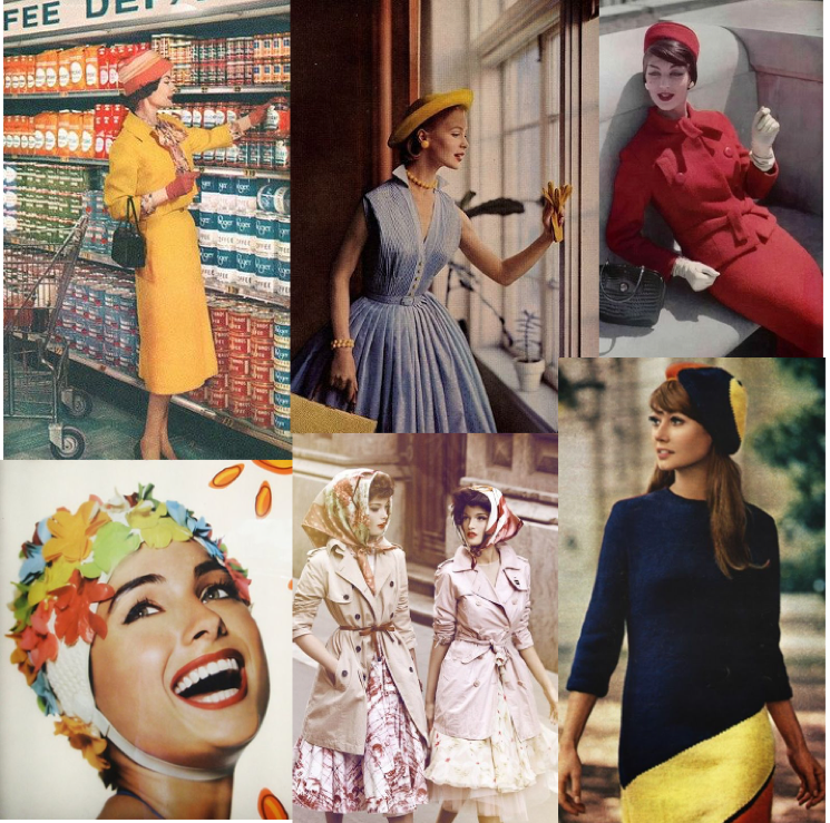 From the 20’s and 30’s Art Deco, we then flown straight to the 40’s and 50’s war time, where good materials were scarce so many milliners turned to unusual decoration materials and recycling upholstery fabrics. During that time, berets, pill box, small doll hats, fedora, bonnet and turbans were simple, easy no-frills hats to be worn for any occasion.