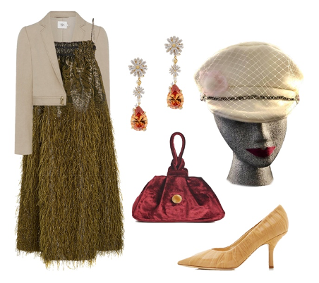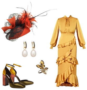 Going to a dinner party would keep you thinking to look at your best while being comfortable to move around during this occasion. If you are in the mood to have fun styling and bold theme, do not hesitate to mix and match your colour palette. The lightweight red hat, Red and Black Pillbox Hat by Marvellous Millinery will definitely complement the mustard frilled dress and complete with small jewellery and your chunky heels as we talk about comfort before. Another hat colour suits this evening look: