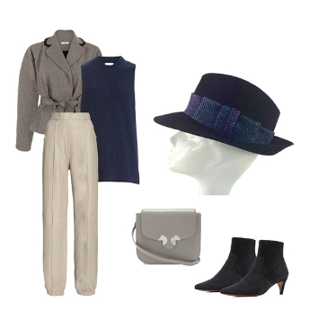 Our top pick for this kind of daily style is the Velour Trilby Hat in Navy Blue from Eleda Hats collection. It brings out the beauty in the turtleneck top, jacket, trouser, bag and Isabel Marant boots.